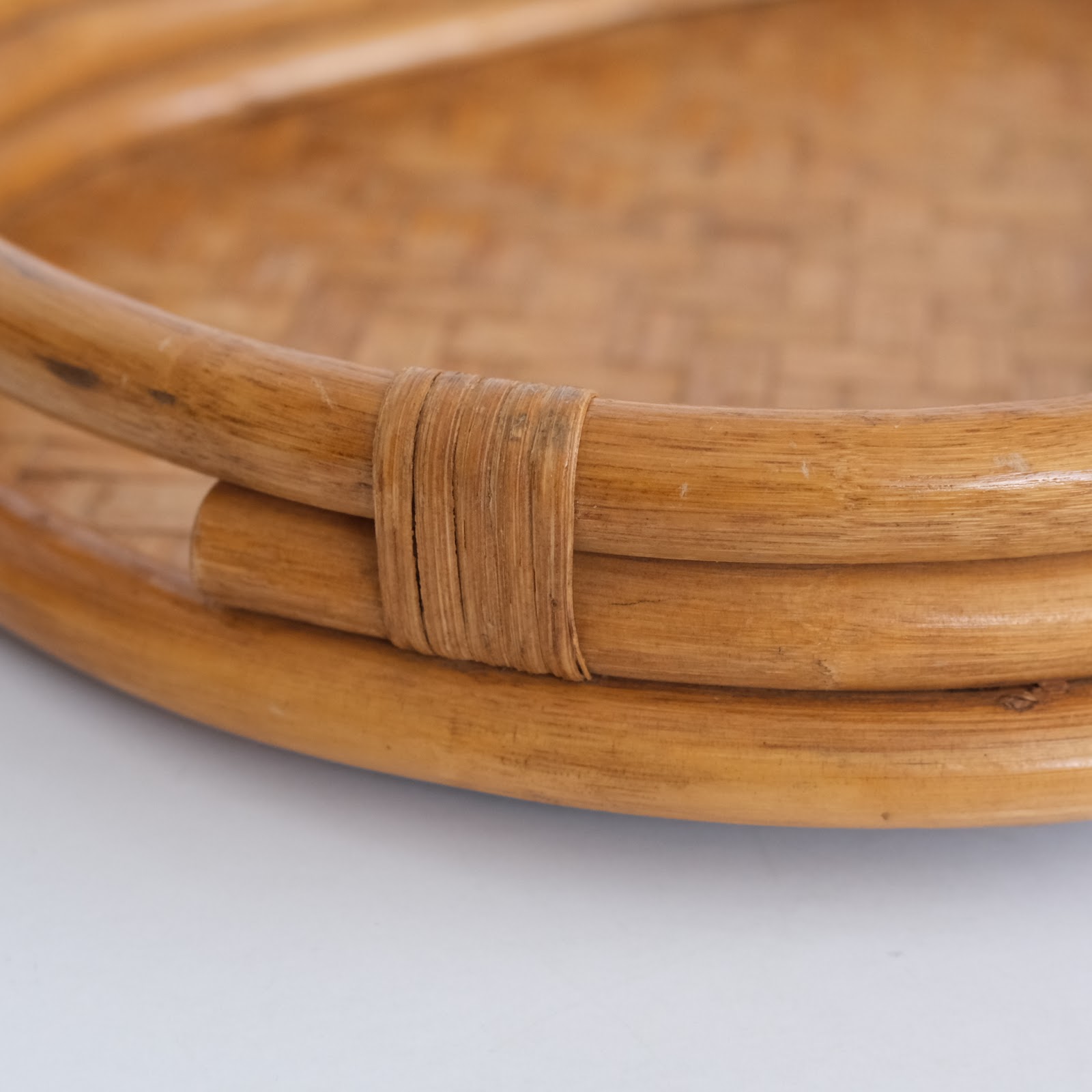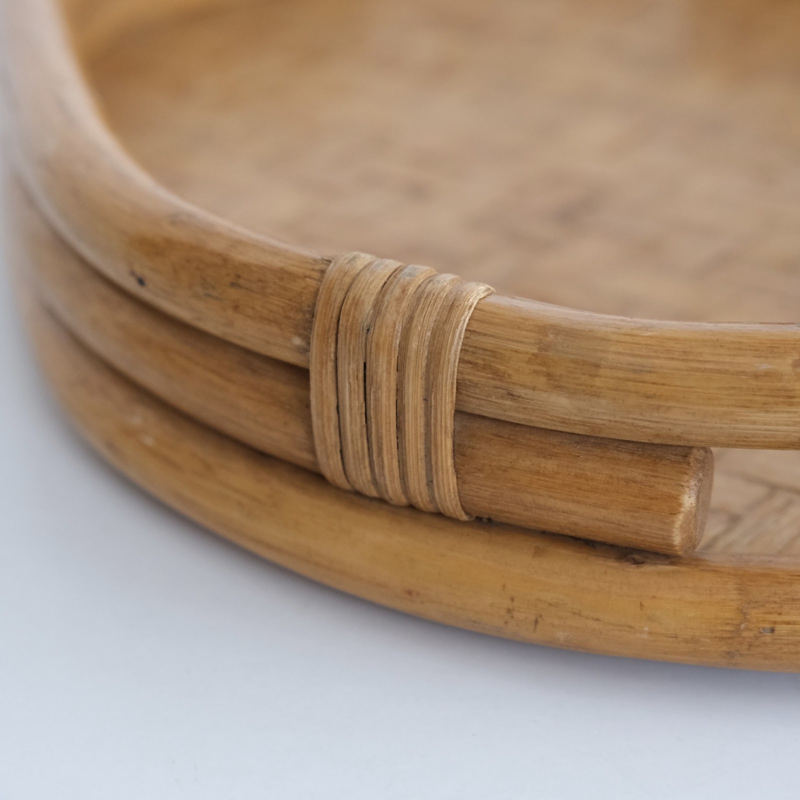 底部には籠などで見かけるような編まれたものが使われており、側面の曲げ木にラタンと思われる素材が巻き付けられています。